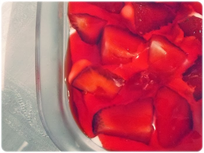 - 1 caixa de morangos lavados e cortados em quatro, salpicados com açúcar.